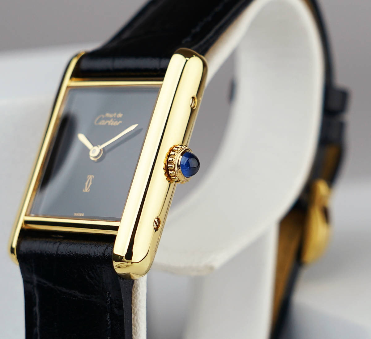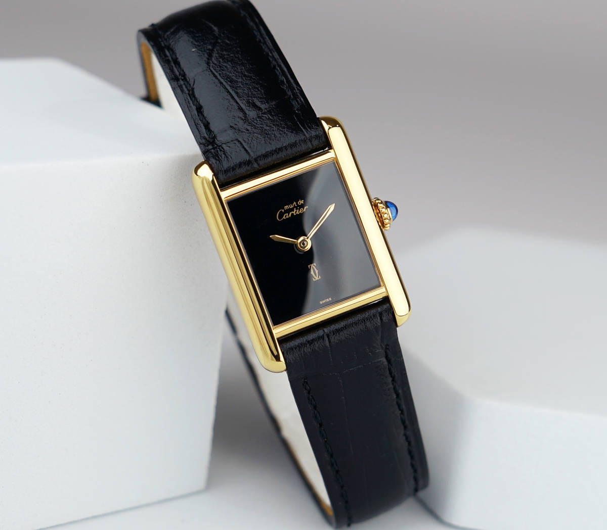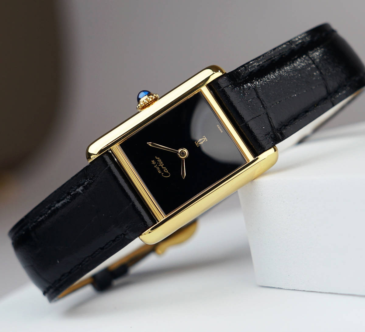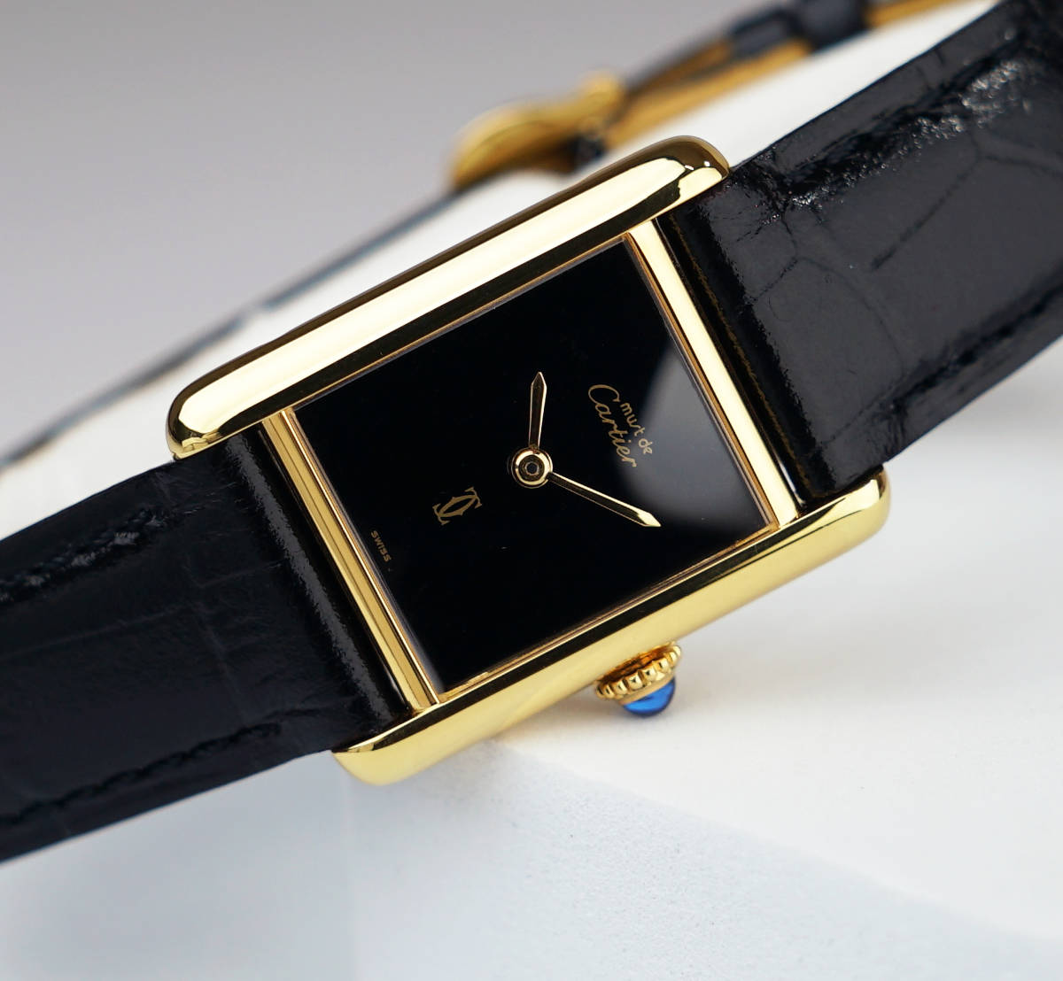 Cartier Must Tank SM mit schwarzem Zifferblatt in einwandfreiem Zustand.