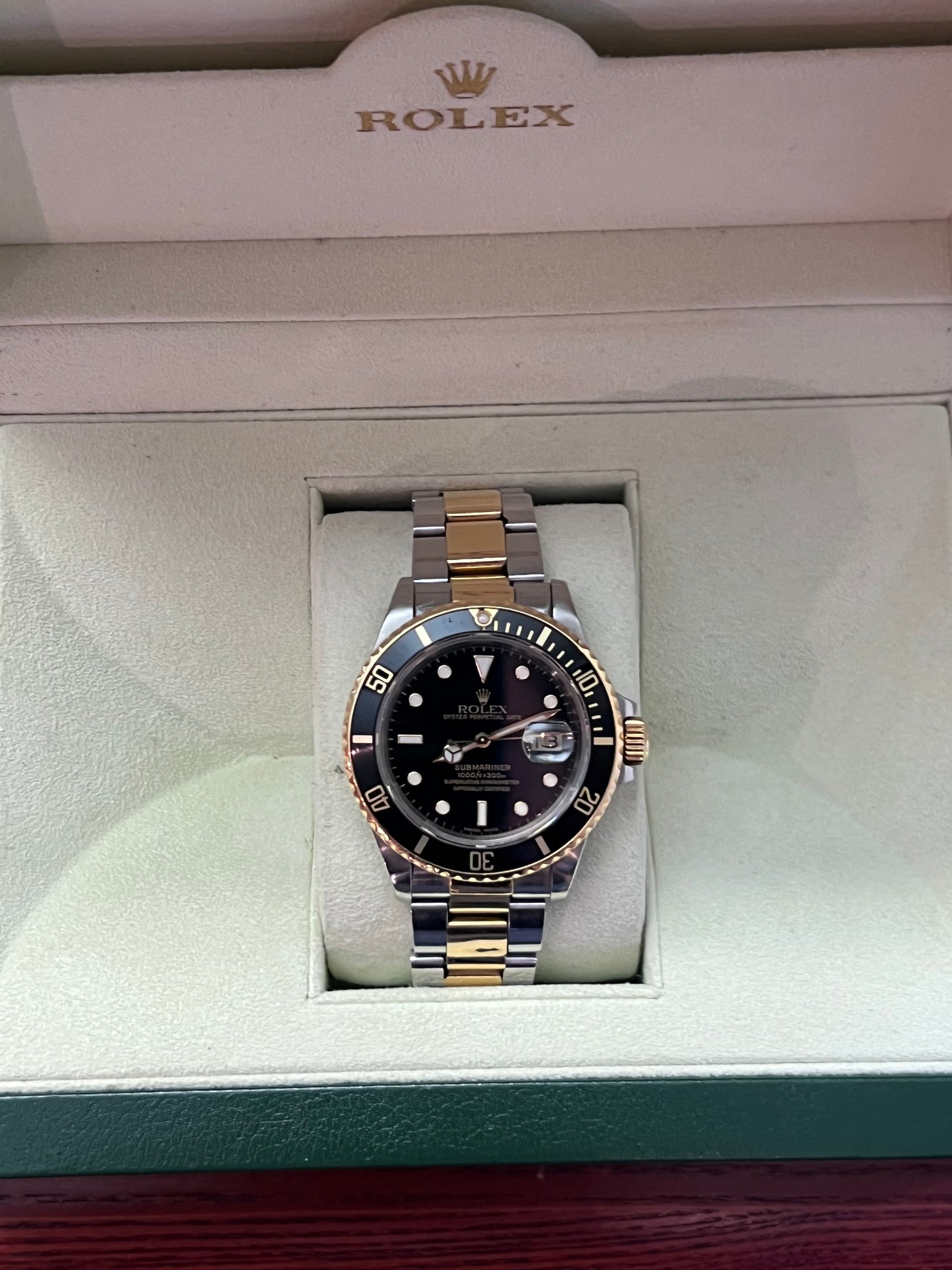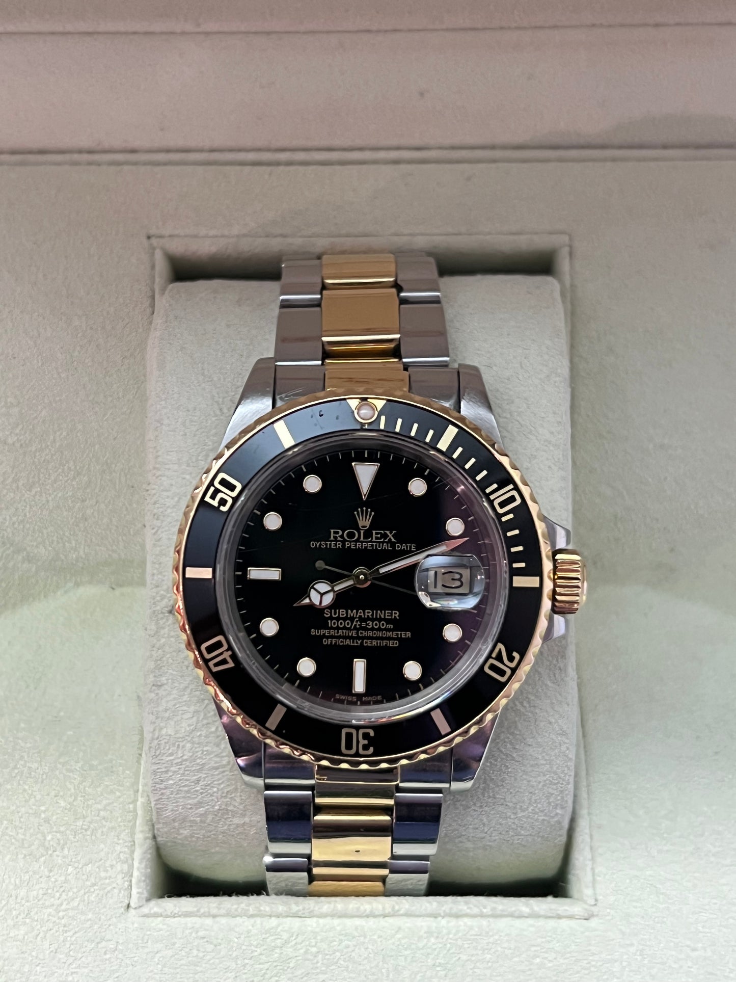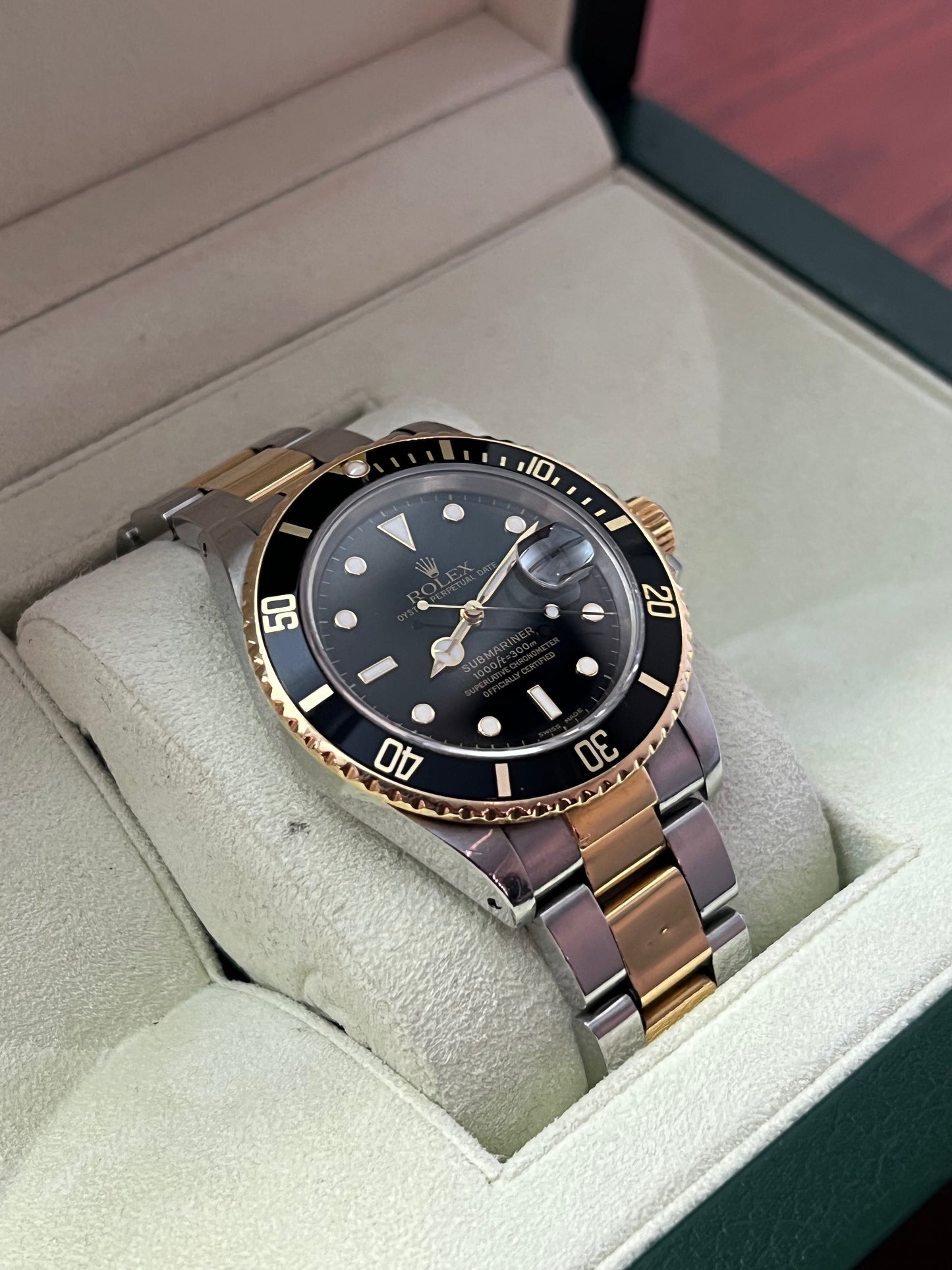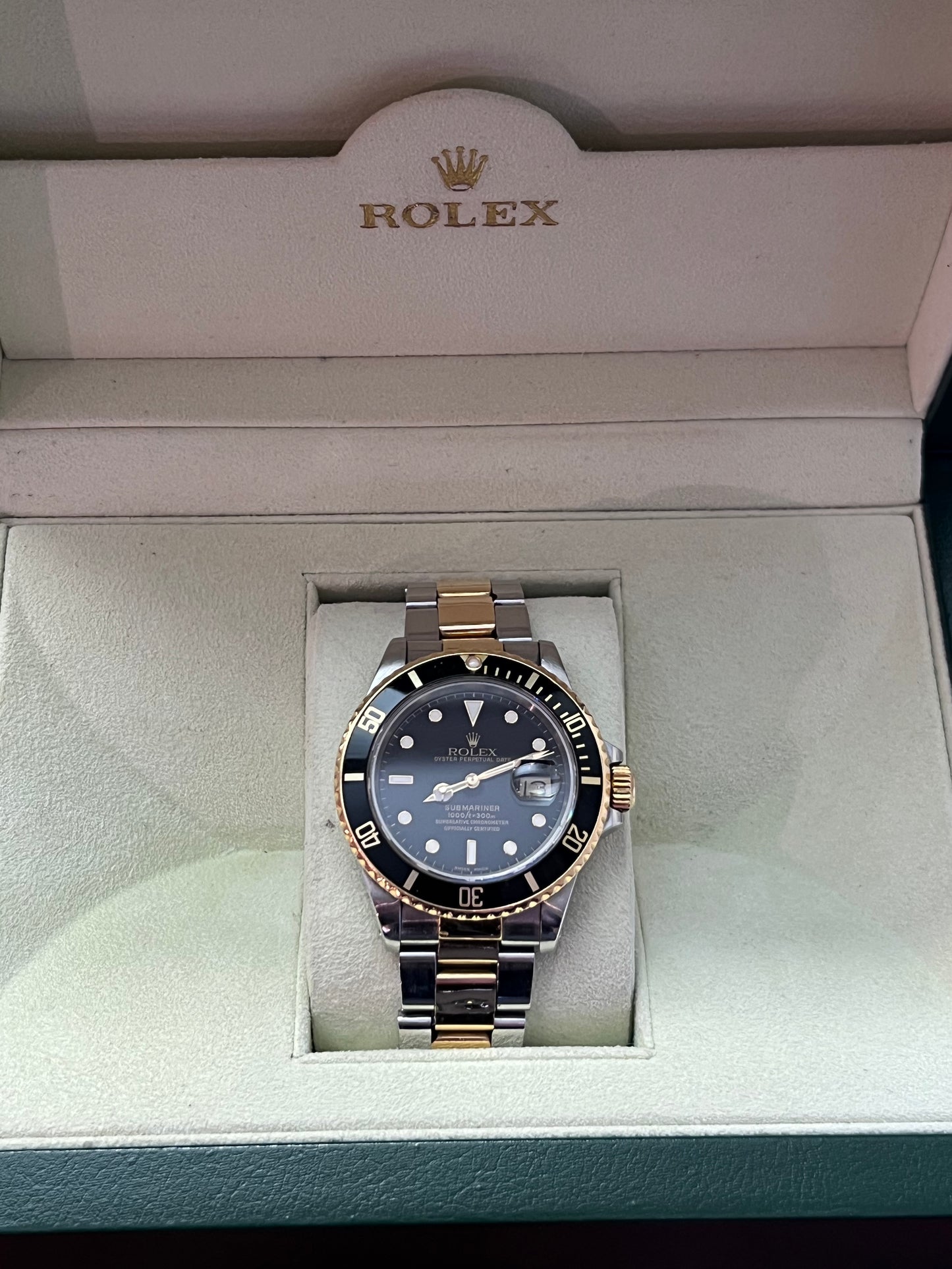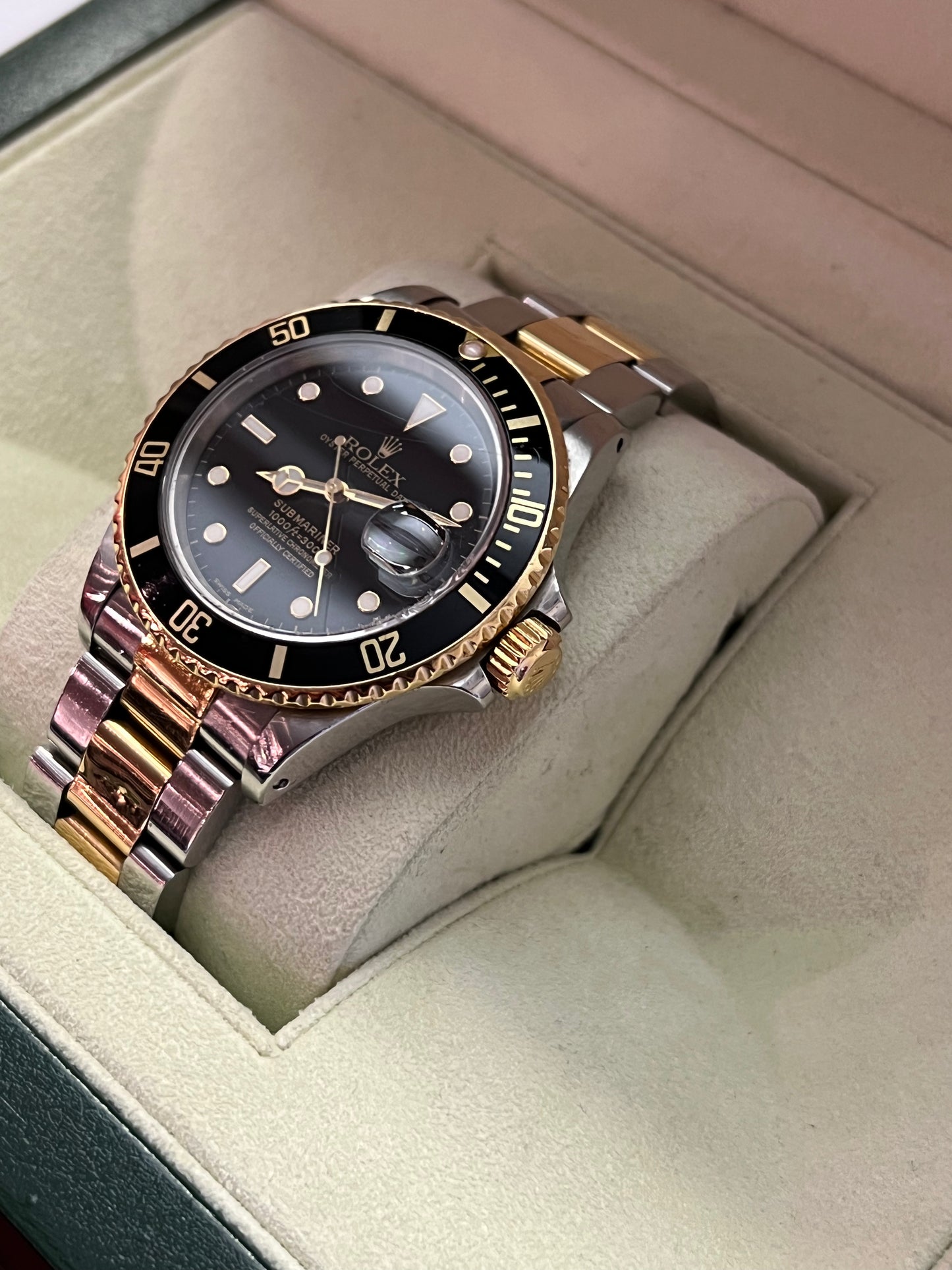Die Rolex Oyster Perpetual Submariner Date Referenz 16803. Diese Uhr kombiniert Edelstahl und 18kt Gelbgold und misst 40 mm im Durchmesser. Sie verfügt über ein Edelstahl-Gold-Oyster-Armband mit Fliplock-Schließe sowie eine schwarze, drehbare Lünette. Das Automatikwerk Kaliber 3035 mit Schnellkalenderfunktion sorgt für präzise Zeitmessung. Das kratzfeste Saphirglas schützt das markante Zifferblatt im Spider-Design, und die Tritiumzeiger sorgen für hervorragende Lesbarkeit.